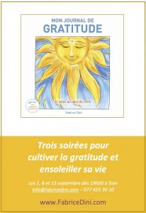 Vendredi 26 novembre 2021 dès 17h30à la librairie du Baobab à Martigny – Explorez la gratitudede 16h30 à 18h: Explorez une petite activité de gratitude avec votre enfantà 18h30: Conférence et présentation du livre « Mon journal de gratitude » et « Mon carnet du soleil ». Découvrez les pouvoirs extraordinaires de la gratitude pour les plus jeunes et les adultes. Evénements gratuits. Réservations souhaitées pour la conférence.
