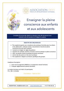 Ils apprendront également à guider différentes pratiques formelles et informelles de pleine conscience, et à proposer une palette variée de pratiques adaptées aux enfants. Les participants seront également amenés à explorer une série de thématiques pouvant être proposées aux enfants et adolescents et à s’entraîner à guider des mouvements en pleine conscience. Ils apprendront également l’art du dialogue exploratoire et comment prendre les retours des enfants après la pratique.