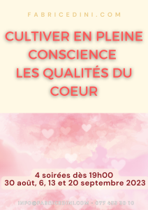 En explorant les six guidances du Dialogue Conscient, vous apprendrez à cultiver la présence et l’authenticité dans vos relations. Les pratiques guidées et les exercices permettront de développer une conscience profonde des schémas de réactivité relationnelle et de favoriser une communication plus consciente et vraie. Rejoignez-nous pour approfondir votre pratique de la pleine conscience au cœur de vos interactions personnelles et professionnelles.