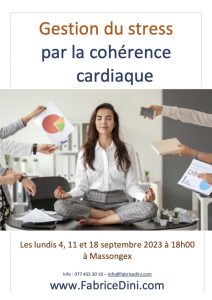 Ces quelques séances seront l’occasion d’acquérir une meilleure compréhension théorique de la cohérence cardiaque. Une palette d’exercices vous permettra également d’expérimenter différentes manières de l’utiliser. Une pratique quotidienne à domicile (idéalement 1 à 3 fois 5 minutes par jour) vous permettra de récolter les bienfaits de la cohérence cardiaque.